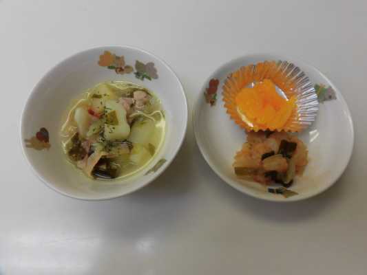 今日の給食は野菜たっぷりスープ、えびのケチャップ炒め、みかんです。