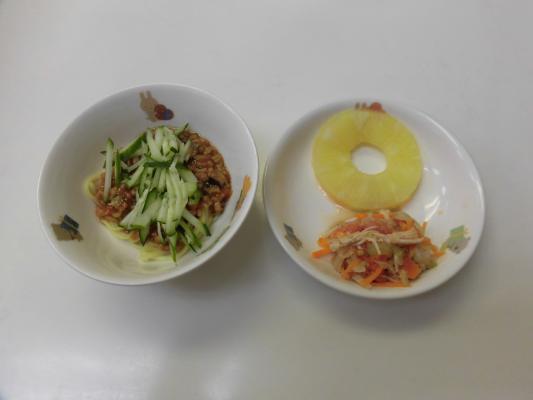 給食はジャージャー麺、バンバンジー、パイナップルです。