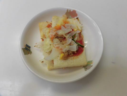食パンにピザソース、玉ねぎ、ピーマン、ツナ缶、コーン缶、ピザ用チーズをかけてオーブンで焼きます。