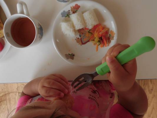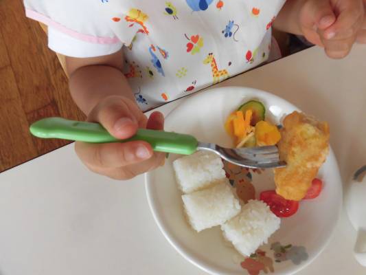 最近、あか2くみでは給食の時にフォークの持ち方を練習しています。