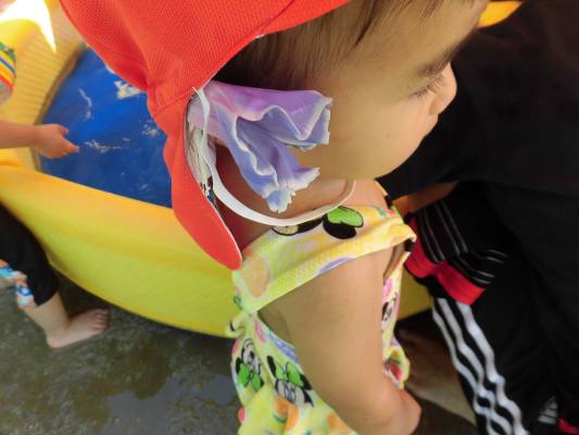 今日は、プール遊び中に和紙に色を染める染め遊びをしました。