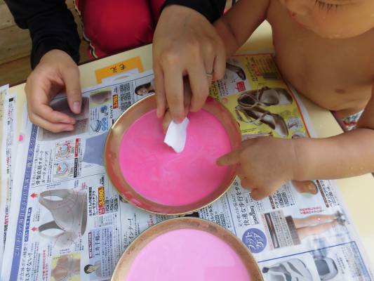 色が染まっていく様子を「すごいね」「きれいだね」と不思議そうにみていました。