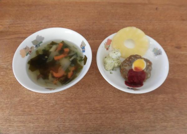 給食はお月見ハンバーグ、だんご汁、パイナップルです。