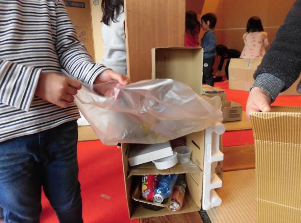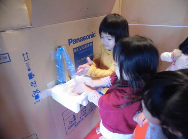 発泡スチロールを組み合わせて「手をあらうところみたいー!」「じゃあここにつける?」「お水はここからでるんよ」と、みんなのアイデアが集まった洗面台の完成!