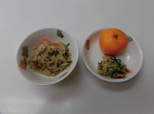 酢みそ和えにはわかめ、かまぼこ、きゅうり、にんじん、キャベツが入っています。
