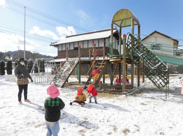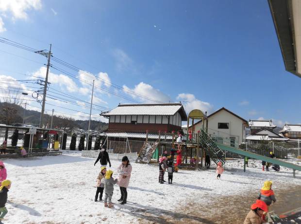 雪が積もっている園庭を見た子どもたちは、「雪だー!」と大喜びです(^0^)