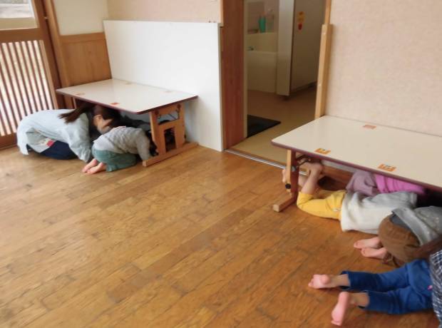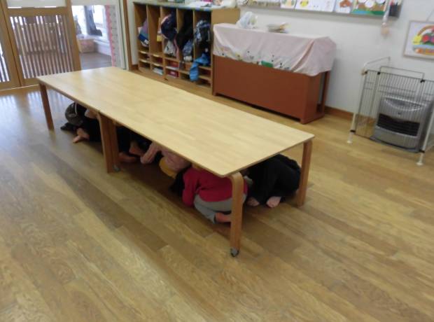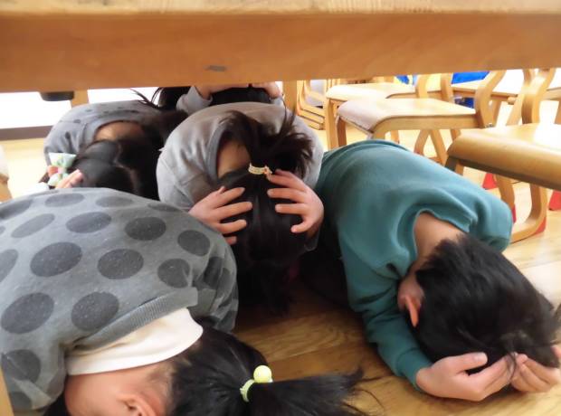 地震が起きたときには”一番大事な頭を守り、机の下に隠れる”