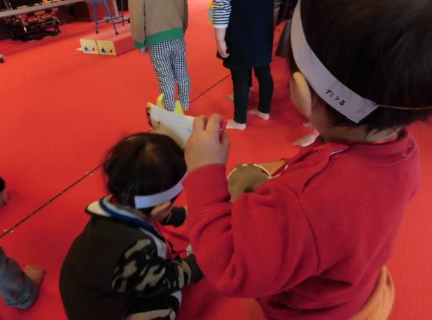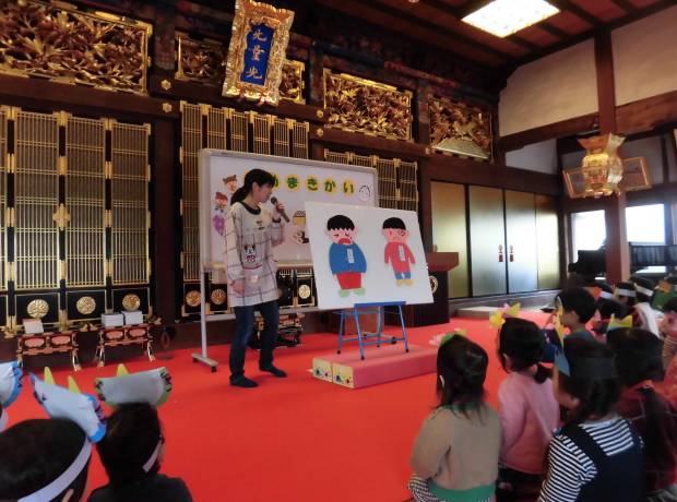 本堂では豆まきについての由来やおなかの中に鬼がいないかお話をききました。