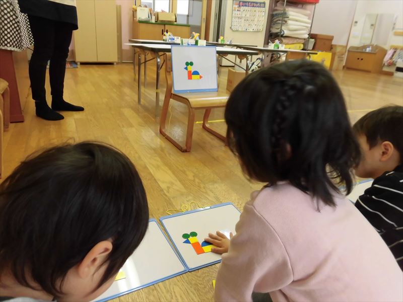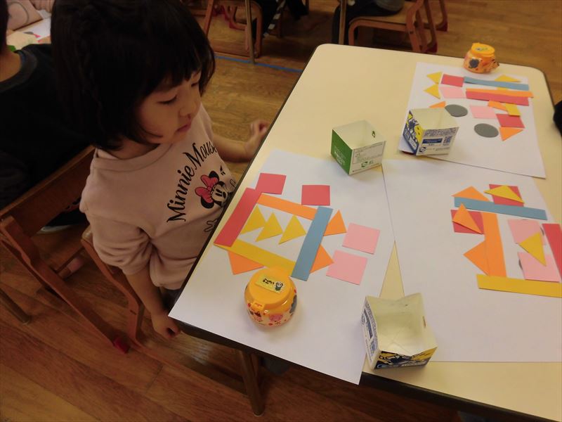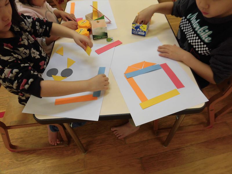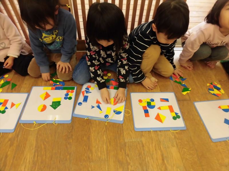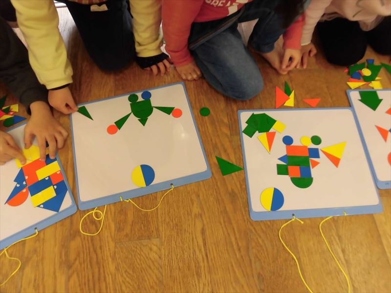 今日は、自由に形を組み合わせて形遊びを楽しみました。
