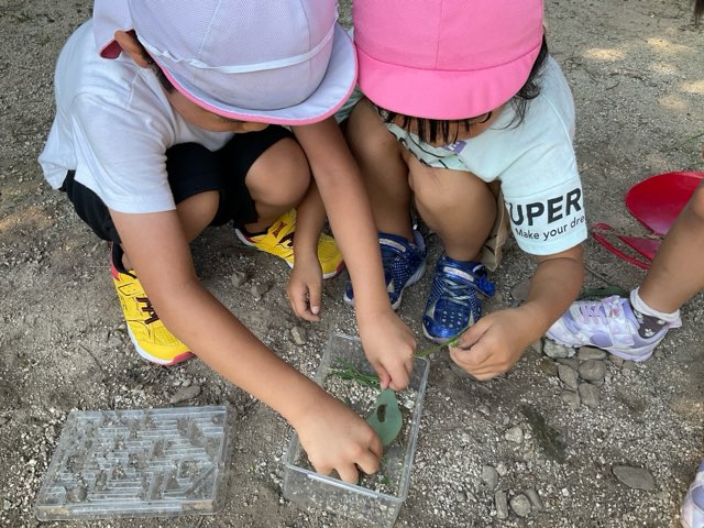 虫かごにいれて、観察用に葉っぱや土をいれてお家をつくってあげてました。