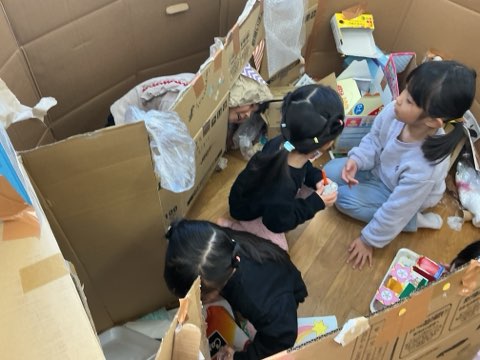 もも組さんの作る姿を真似っこしながら大きな家を作ったり、紙を切って貼ったりと楽しみました