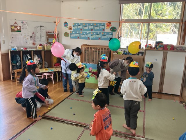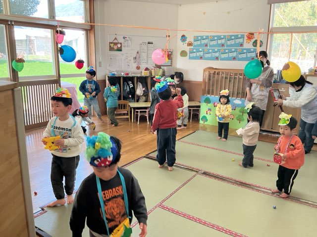 あか1くみさんとの交流では風船を鬼に見立ててみんなで豆まきをしました。