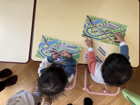 朝のお集まりでたくさんお外で遊ぼうねとお話しした後、外に行く前にマグネット絵本で遊びました。