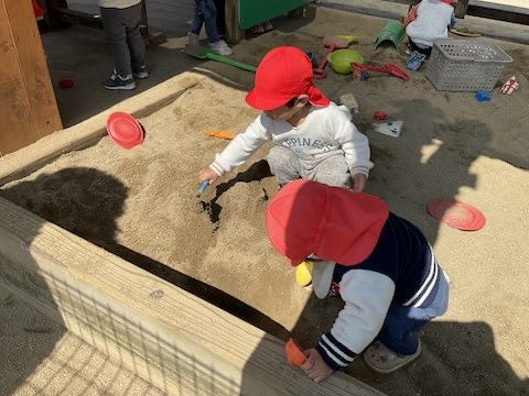 楽しみにしていた戸外遊びではたくさん走った後に砂場に自然と集まり、穴を掘ったりご飯を作って遊びました。