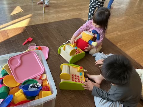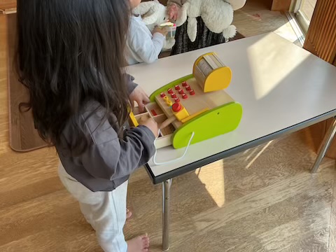 今日は「レジピッピがいい!」と声が上がったので、レジスターとままごとのおもちゃを出してあそびました!