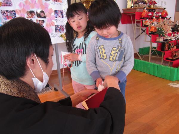 ここで鐘を鳴らすよ、ここはこうするんよ、とひとつひとつ教えてもらいながら、一生懸命ももさんの姿をまねてやるあおぐみさん。