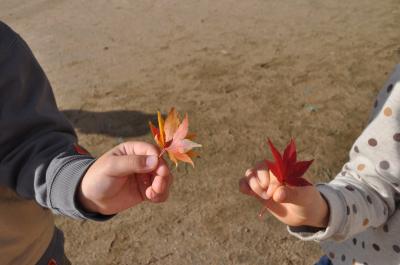 子どもたちは風で飛ばされてきたいろんな葉っぱを集めたり、