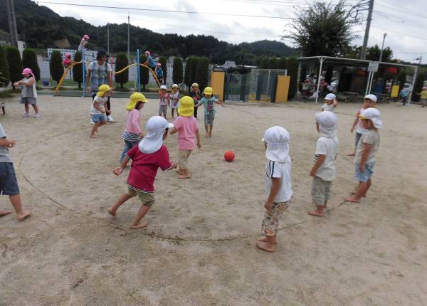 今日は久しぶりに園庭でみんなで転がしドッヂボールをしました。