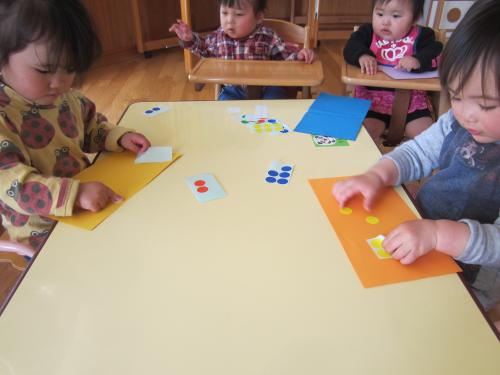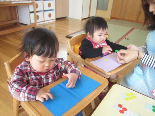 一歳児さんは、指先を器用に使いたくさんシールをはりました。