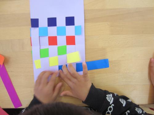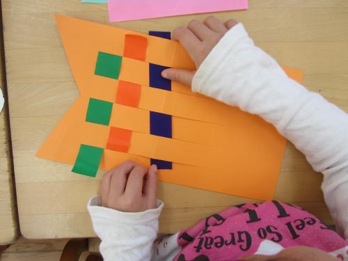 画用紙に細長く切った折り紙を編んでいき、模様を作っていきました。