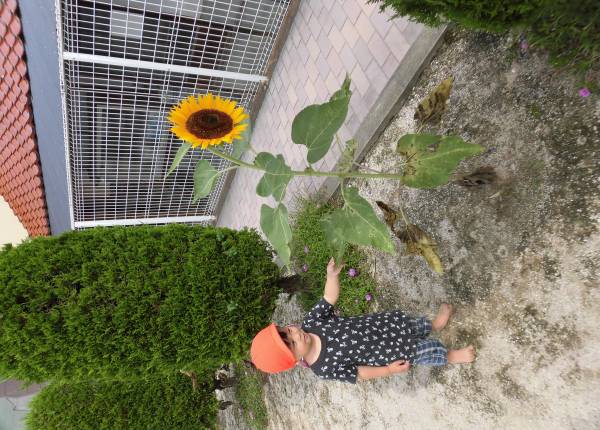 園庭に咲いているももぐみさんが育てたひまわりが1歳児さんの背よりも大きく育ち指さしながら