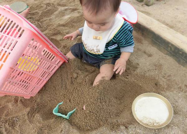 お砂場では、0歳児さんは保育士が足に砂をかぶせてあげるとひんやり気持ちよさそうな表情をみせてくれました。