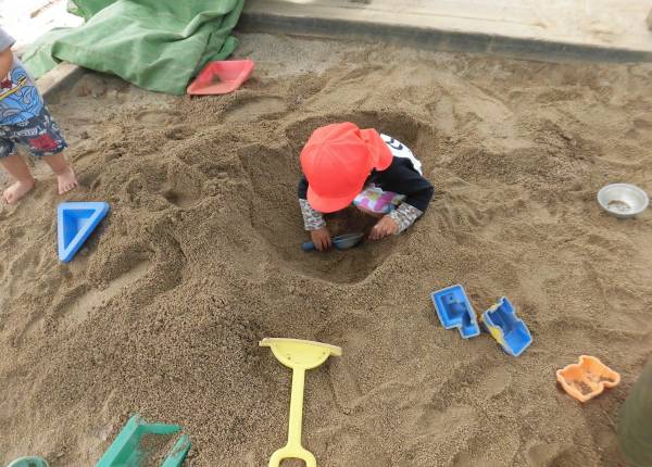今日は心地よい天候であか1くみさんはお砂場遊びを楽しみました。