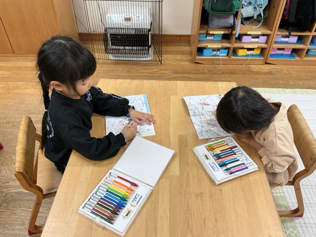 部屋でぬりえを楽しみました。