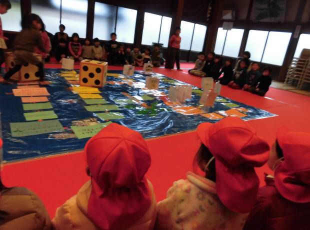 あか2くみさんも本堂へ行き、すごろく大会の応援に行きました!