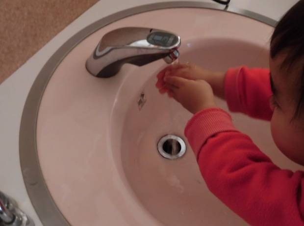 手洗いの歌を先生と歌いながらきれいに洗います。