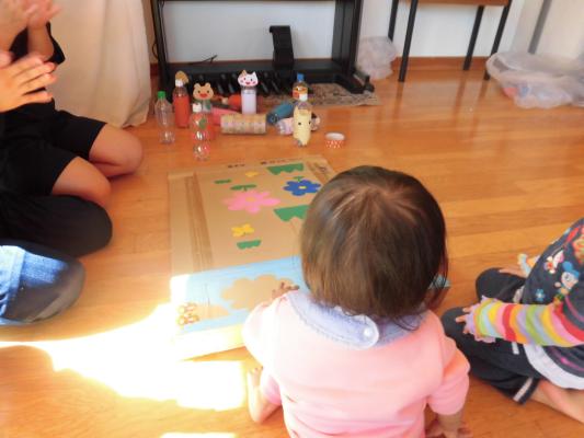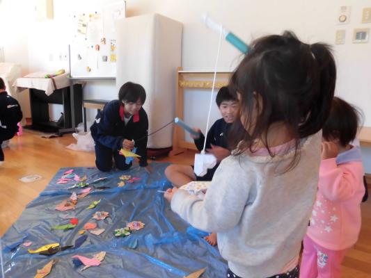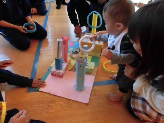 あか1くみさんは、たくさんの大きいお兄さん、お姉さんに少し圧倒されたようですが、優しくたくさん声をかけてもらいながら遊びに入っていくことができました。