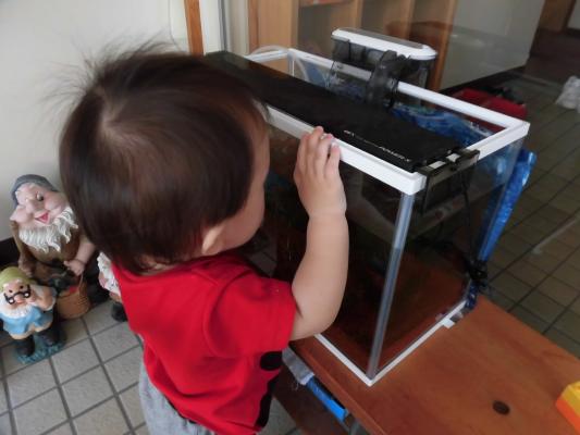 そして、今週のめだかは、小さな0歳児さんも水槽の中を不思議そうにのぞいて集中して見ていました。