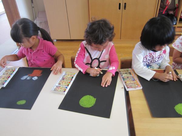 まずは、月。きれいなまんまるになるよう丁寧に色を塗っていきます。中にうさぎの影を描いた子もいました。