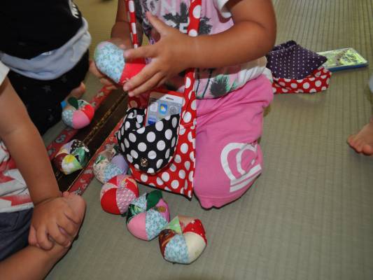 今日の室内遊びでは、手作りのかばんを持ってお買い物ごっこをしました。