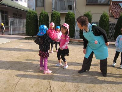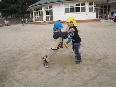 今朝の園庭遊びでは、異年齢での関わりがよく見られ、お兄さんお姉さんに面白そうな遊びを優しく教えてもらったり、年下の子には力加減をしながらおすもうをして遊ぶ姿がありました。