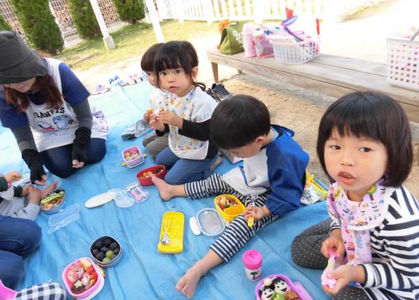 お昼は、みんなが楽しみにしていたお弁当を園庭で食べました!