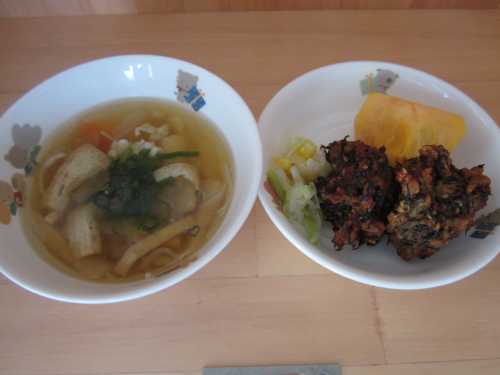 給食はごまひじき団子、八宝汁、柿です。