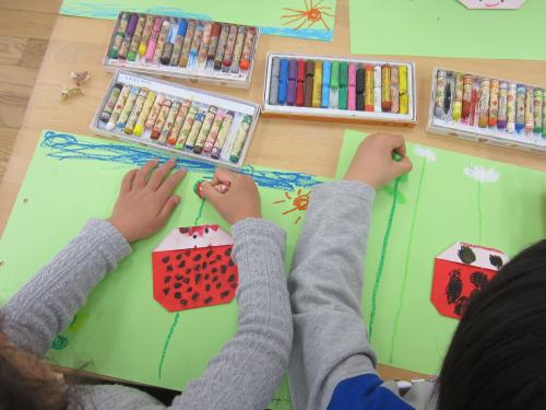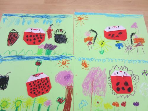 作ったてんとうむしを画用紙に貼り、描画活動もしました!