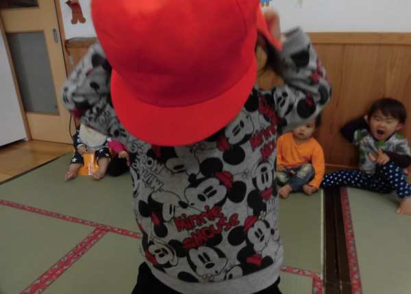 自分で帽子をかぶる練習中です(^◇^)