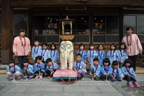 お釈迦様の誕生を祝い、あおぐみのみんなも力を合わせて、ぞうを引っ張りました。
