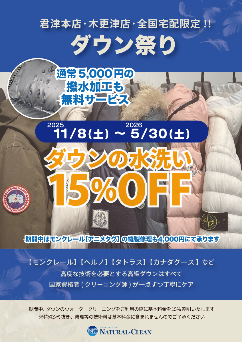 ナチュラルクリーン《秋冬限定》ダウン祭り開催!! キャンペーン 2025年10月25日 配信 ナチュラルクリーン本店&全国宅配限定企画【ダウン祭り】 下記の日程で開催いたします。 ダウンジャケット・ダウンコート・ダウン布団などすべて15%OFF!! さらに【ダウンジャンバー・コートの撥水加工 無料サービス】も同時開催!! ■期間 2025年11月8日(土)~2026年5月30日(土) ■対象 ダウンジャンバー ダウンコート ダウンベスト ダウンシングル布団 ダウンダブル布団 ≪店頭にお持ち込みのお客様へ≫ 期間中、君津本店・木更津店にお持ち込みいただくと その場で「基本料金15%OFF & ダウンジャンバー・コート撥水加工無料」 詳しくは各店舗スタッフにお尋ねください。 ≪全国宅配をご利用のお客様へ≫ 期間中、宅配にてウォータークリーニングをご利用の際に 宅配伝票に同封の「お客様受付表」に【ダウン祭り希望】とご記入ください。 キレイで暖かい冬支度に! ダウンがお得にきれいになるチャンスです。この機会をお見逃しなく。