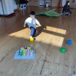 今日は散歩の予定でしたが、雨が降ったので室内で散歩ごっこをしました。お芋畑までみんなで散歩をして、畑のお芋を抜きました。力いっぱい蔓を引っ張ってお芋が掘れた時には、嬉しそうな笑顔が見られました。その後、お芋の蔓をシッポに見立てて、みんなでしっぽ取りを楽しみました。