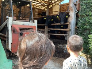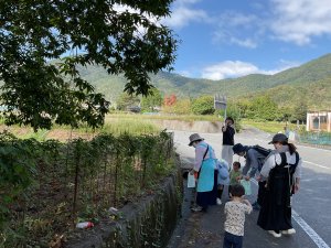 今日は風が心地よい中、散歩に出かけました。金木犀の香りを楽しんだりお花や木の実を見つけたり、秋を感じながら歩きました。牛舎の前では、牛に手を振っていると牛がどんどん集まってきて、みんな大興奮でした。