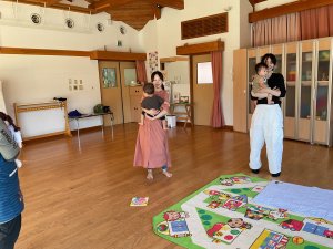 今日は、親子でふれあい遊びを楽しみました。歌や絵本のお話に合わせてこちょこちょしたり体と体を「ぴったんこ」とくっつけ合ったりして、ふれあいました。子どもたちの嬉しそうな笑顔がたくさん見られ、私たちも癒されました。