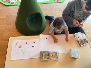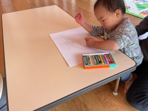 今日は、お絵描きやシール貼りをしました。色々な色のクレヨンを使って楽しそうにお絵描きをしました。シール貼りでは、車のシールを持って描いた道路の上を走らせる姿がかわいかったです。