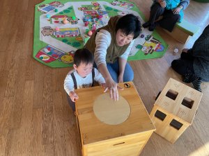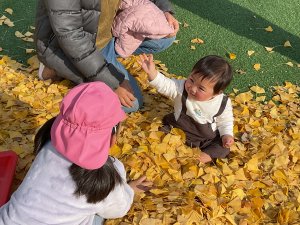 普段通りに遊びに来られたお子さんは、玩具や楽器で楽しく遊びました。その後、園庭に作られたイチョウの葉の絨毯の上で遊びました。葉っぱの感触を楽しんだり、こども園の年長さんと触れ合ったりして、楽しい時間を過ごしました。