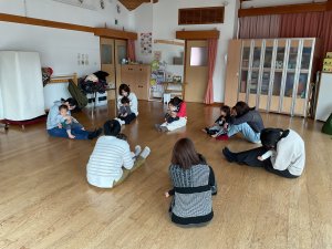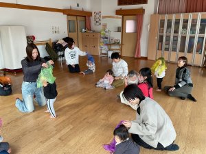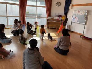 今日は、講師の先生に来ていただいてリトミックをしました。親子や兄弟で音楽に合わせて触れ合ったり、スカーフを振ったり被って「いないいないばあっ!」をしたり、みんなで楽しみました。「ふうせん」の歌のシアターでは、風船と同じ色のものをみんなで考える姿が微笑ましかったです。