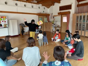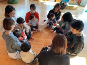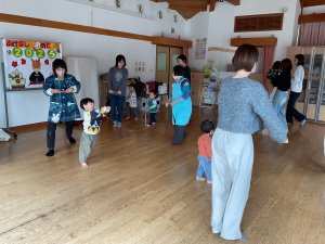 新年初日はリトミックでした。久しぶりのお友だちとの再会に、子どもたちも嬉しそうでした。音楽に合わせて、スティックで馬の足音やお餅つきを表現して、親子で触れ合いながら楽しみました。