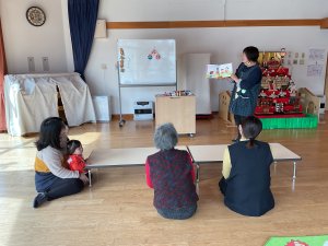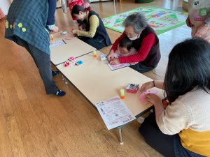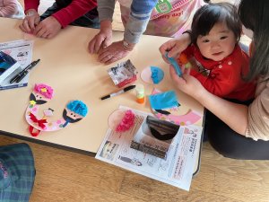今日は、ひな人形の制作をしました。支援センターに飾ってあるひな人形をいつも嬉しそうに見ていた子どもたち。おひな様の絵本や実物のひな人形を見ながら、シールを貼ったりお花紙を丸めたりしてひな人形を作りました。