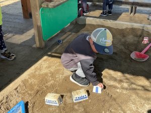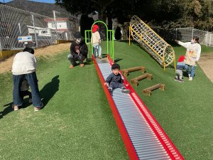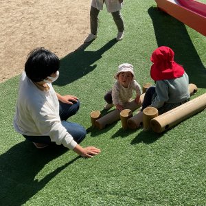 今日は、お天気も良くぽかぽか陽気の中、戸外遊びを楽しみました。すべり台などの遊具や砂場、ボール遊びで園児さんとも交流しながら遊ぶ、微笑ましい姿も見られました。斜面やすべり台では、何度も挑戦しながら自分でできるようになる姿も見られ、成長を感じることができました。